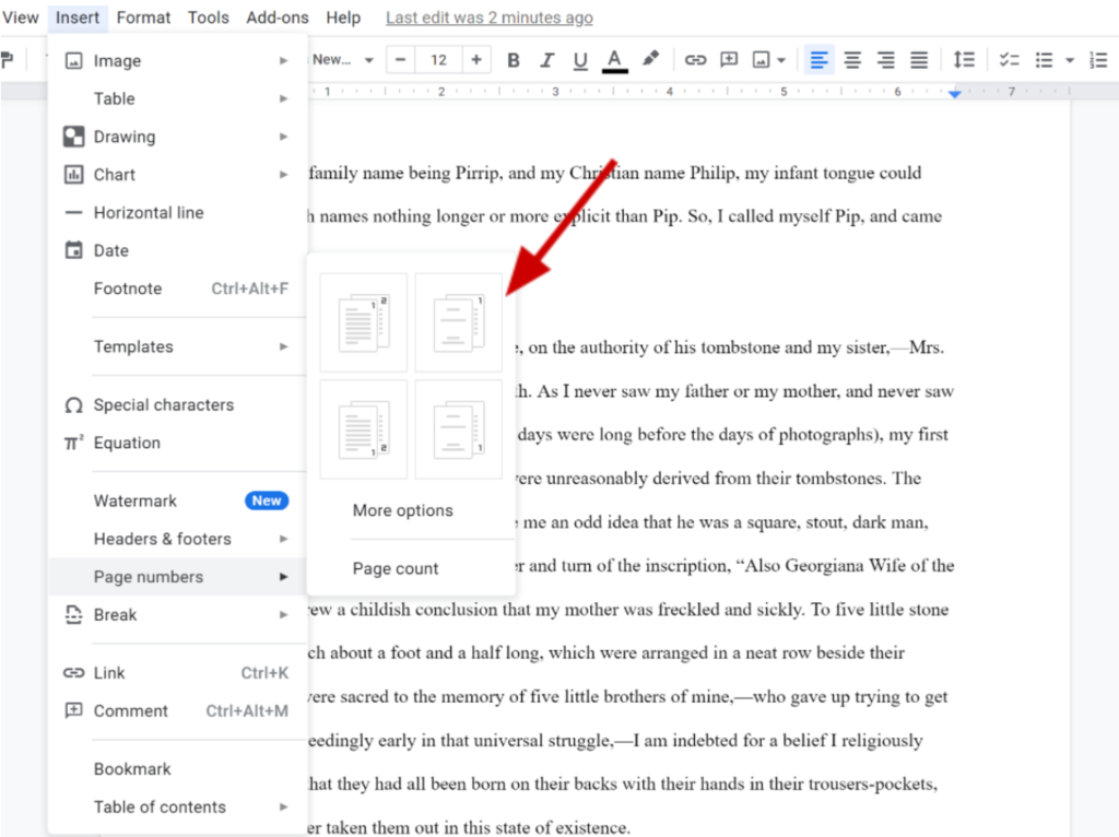 • Insert → Page numbers → [the icon showing page numbers on the top right, starting with the second page]